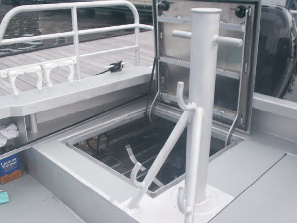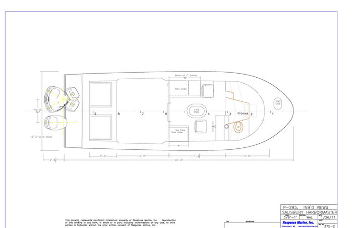 This design kit was derived from our several, similarly sized fire/rescue boats and built by Viking Welding. The profile and cabin, in particular, are similar to those earlier boats, but the bottom was substantially tweaked to trim properly with the weight and CG changes that resulted from eliminating the firefighting equipment, which generally contributes quite a bit of weight aft. Powered by twin 300 Verados, the pictured hull topped out at about 48 mph during early sea trials without any performance tweaking. Like it's fire/rescue boat cousins, the bow features are relatively large radius bow cone.