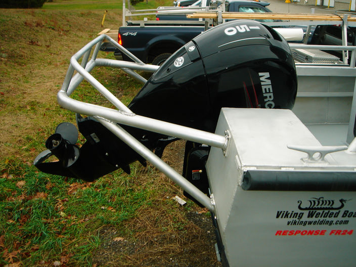 The greatest variation in transom treatments is naturally with our outboard powered boats. For these we have done everything from traditional cut-outs in radiused or flat transoms to inset wells, weld-on brackets and integral brackets. Our most common treatment, particularly with twin engines, is the full width cut-down with a false transom ahead of the well. In this installation the hull bottom and side plating continues to the engine transom, and thus engine transom is truly the transom of the boat. Their are many variants to this style, which provide a range of looks and functions.